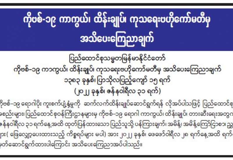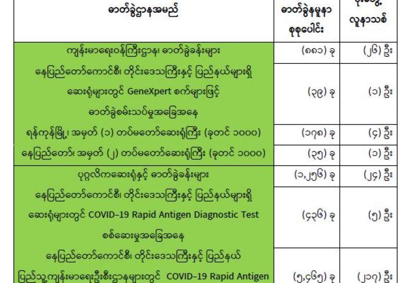 ကျန်းမာရေးဝန်ကြီးဌာနအနေဖြင့် နိုင်ငံအတွင်း ကူးစက်ဖြစ်ပွားနေသော COVID-19 ရောဂါ ကာကွယ်၊ ကုသ၊ ထိန်းချုပ်ရေးလုပ်ငန်းများကို အရှိန်အဟုန်မြှင့် ဆောင်ရွက်လျက်ရှိပါသည်။
