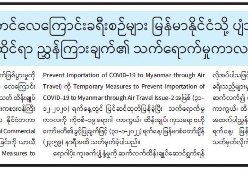 ၁။ ကျန်းမာရေးဝန်ကြီးဌာနသည် “ကိုဗစ်-၁၉ ရောဂါ မျိုးရိုးဗီဇပြောင်း ရောဂါပိုး စောင့်ကြပ် ကြည့်ရှုခြင်းလုပ်ငန်း” များကို စဉ်ဆက်မပြတ် ဆောင်ရွက်လျက်ရှိရာ မြန်မာနိုင်ငံသို့ ပြည်ပနိုင်ငံများမှ ကယ်ဆယ်ရေးလေယာဉ် (Relief Flight) များဖြင့် ပြန်လည်ဝင်ရောက်လာသူများတွင် SARS-CoV-2 Variant Omicron (အိုမီခရွန်) ရောဂါပိုးတွေ့ရှိမှုများနှင့်ပတ်သက်၍ ကျန်းမာရေးဝန်ကြီးဌာနမှ အချိန်နှင့်တစ်ပြေးညီ သတင်းထုတ်ပြန်ပေးလျက်ရှိပါသည်။
