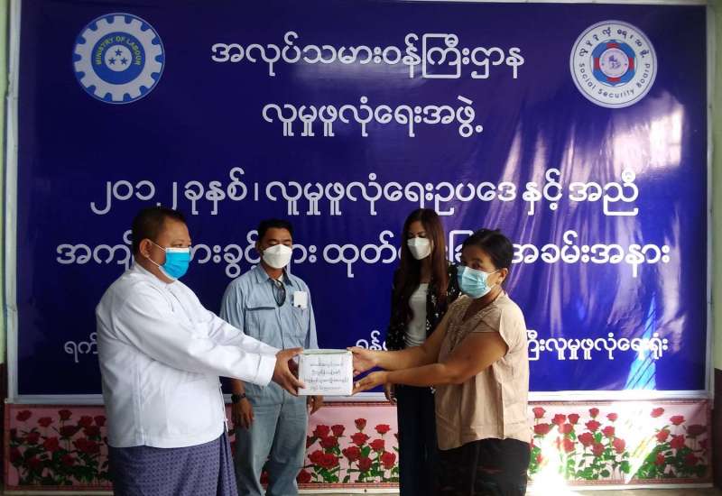 အလုပ်သမားဝန်ကြီးဌာန၊ လူမှုဖူလုံရေးအဖွဲ့၊ မြို့နယ်လူမှုဖူလုံရေးရုံးခွဲ(၇)တွင် အကျုံးဝင် မှတ်ပုံတင်ထားသည့် အာမခံအလုပ်သမား၏ လုပ်ငန်းခွင်မတော်တဆထိခိုက်သေဆုံးမှုအတွက် ဥပဒေနှင့်အညီ အကျိုးခံစားခွင့် ထုတ်ပေးခြင်းကို ယနေ့နံနက်ပိုင်းတွင် ရန်ကုန်မြို့ တိုင်းဒေသကြီးလူမှုဖူလုံရေးရုံး တိုင်းအစည်းအဝေးခန်းမ၌ ပြုလုပ်သည်။