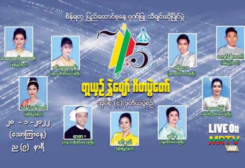 စိန်ရတုပြည်ထောင်စုနေ့ကို ဂုဏ်ပြုသောအားဖြင့် “တူယှဉ်နွှဲပျော် ဂီတပွဲတော်” သီချင်းဆို ပြိုင်ပွဲ အုပ်စု(င) ဒုတိယပွဲစဉ်ကို ဇန်နဝါရီ ၂၈ ရက် (သောကြာနေ့) ညတွင် မြန်မာ့အသံနှင့် ရုပ်မြင်သံကြားမှ တိုက်ရိုက် Live ရိုက်ကူးထုတ်လွှင့်မည်။