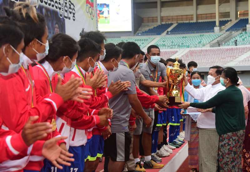 အားကစားနှင့်လူငယ်ရေးရာဝန်ကြီးဌာန၊ အားကစားနှင့် ကာယပညာဦးစီးဌာနက ကျင်းပလျက်ရှိသည့် တိုင်းဒေသကြီးနှင့်ပြည်နယ် အသက် (၂၅) နှစ်အောက် အမျိုးသမီးဘောလုံးပြိုင်ပွဲ၏ ဗိုလ်လုပွဲနှင့် ဆုချီးမြှင့်ပွဲ အခမ်းအနားကို ယနေ့မွန်းလွဲပိုင်းတွင် နေပြည်တော်ရှိ ဝဏ္ဏသိဒ္ဓိဘောလုံး အားကစားကွင်း၌ ကိုဗစ်-၁၉ ကာကွယ်၊ ထိန်းချုပ်ရေး စည်းမျဉ်း၊ စည်းကမ်းများနှင့်အညီ ကျင်းပရာ နိုင်ငံတော်စီမံအုပ်ချုပ်ရေး ကောင်စီဥက္ကဋ္ဌ၊ နိုင်ငံတော်ဝန်ကြီးချုပ် ဗိုလ်ချုပ်မှူးကြီး မင်းအောင်လှိုင်နှင့်ဇနီး ဒေါ်ကြူကြူလှတို့ တက်ရောက်ကြည့်ရှု အားပေးသည်။