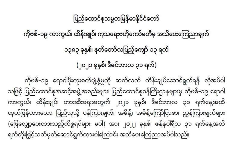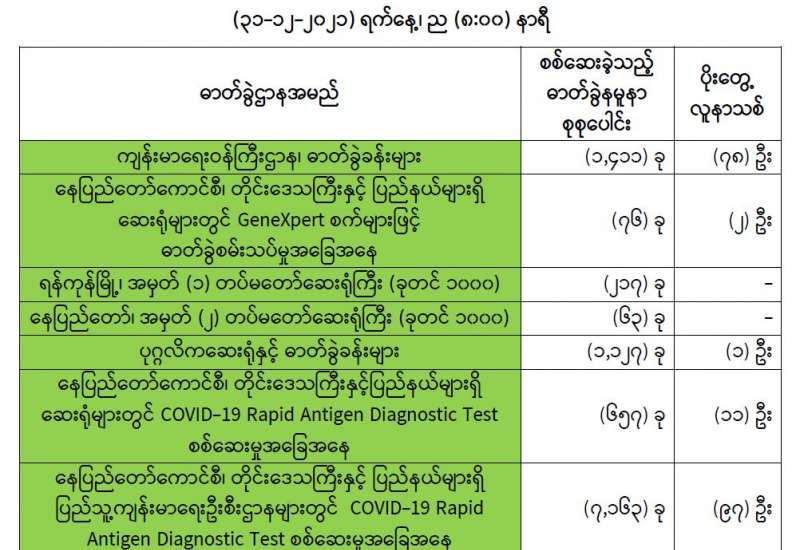 ကျန်းမာရေးဝန်ကြီးဌာနအနေဖြင့် နိုင်ငံအတွင်း ကူးစက်ဖြစ်ပွားနေသော COVID-19 ရောဂါ ကာကွယ်၊ ကုသ၊ ထိန်းချုပ်ရေးလုပ်ငန်းများကို အရှိန်အဟုန်မြှင့်ဆောင်ရွက်လျက်ရှိပါသည်။