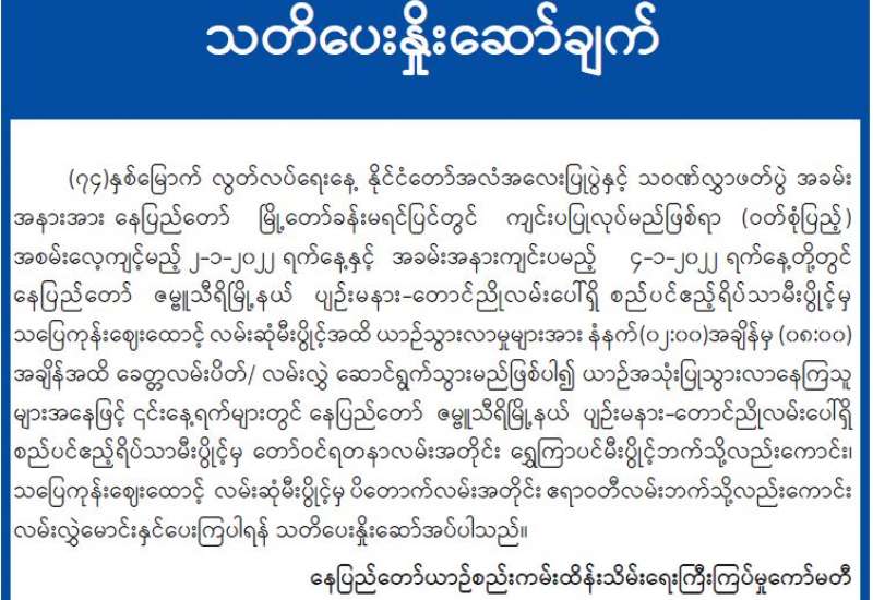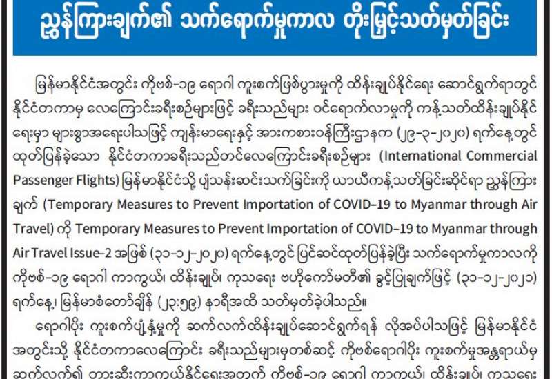ကိုဗစ်-၁၉ ကမ္ဘာ့ကပ်ရောဂါကြောင့် ပြည်ပနိုင်ငံများတွင် အခက်အခဲ ဖြစ်နေကြသည့် မြန်မာနိုင်ငံသူ၊ နိုင်ငံသားများအား အမိမြန်မာနိုင်ငံတော် သို့ပြန်လည်ဝင်ရောက်နိုင်ရေး ကယ်ဆယ်ရေးလေယာဉ်(Relief Flight) များဖြင့် လည်းကောင်း၊ တပ်မတော်စစ်ရေယာဉ်များဖြင့် လည်းကောင်း၊ နယ်စပ်ဂိတ်များမှ ပြန်လည်ဝင်ရောက် စေခြင်းဖြင့် လည်းကောင်း အမိမြန်မာနိုင်ငံတော်၏ အရိပ်အာဝါသအောက်တွင် ကြည့်ရှုစောင့် ရှောက်မှုပေးနိုင် ရေး နိုင်ငံတော်စီမံအုပ်ချုပ်ရေးကောင်စီက စီစဉ်ဆောင်ရွက်ပေးလျက်ရှိသည်။