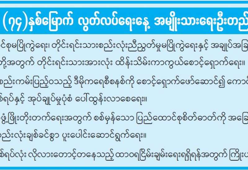 လွတ်လပ်သောနိုင်ငံတွင် မွေးဖွားရှင်သန်လာသော ကျွန်ုပ်တို့အဖို့ “လွတ်လပ်ရေး” ဟူသော ဝေါဟာရစကားလုံးသုံးလုံးကို သိရှိကြသော်လည်း ထိုစကားလုံးသုံးလုံး၏အနှစ်သာရ၊ အဓိပ္ပာယ်၊ တန်ဖိုးတို့ကို ကျယ်ကျယ်ပြန့်ပြန့် လေးလေးနက်နက် ထဲထဲဝင်ဝင်သိရှိကြသူ နည်းပေလိမ့်မည်။ လွတ်လပ်သောနိုင်ငံတွင် နေထိုင်ကြသော နိုင်ငံသားများအဖို့ လွတ်လပ်ရေး၏အဓိပ္ပာယ်ကို သိရှိကြရန်လိုအပ်ပေသည်။