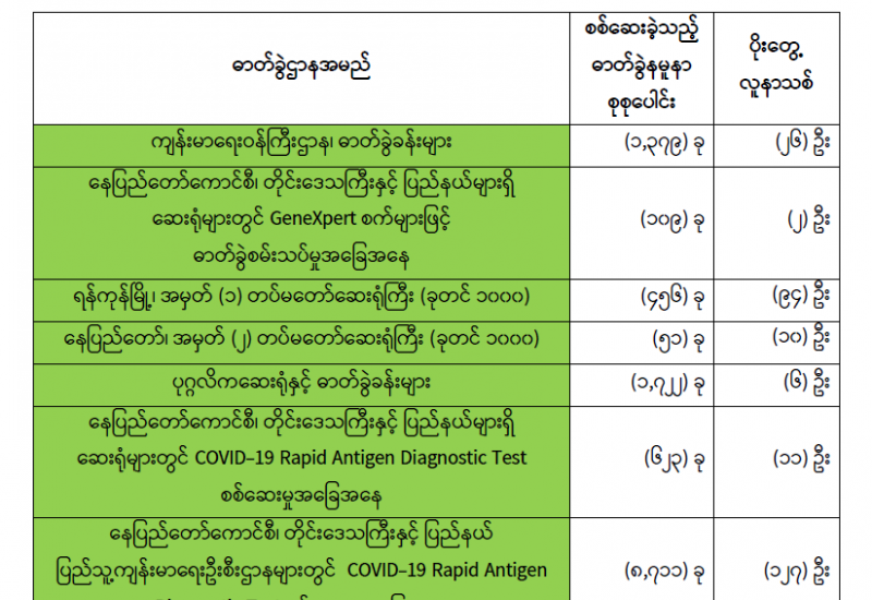 အကောက်ခွန်ဦးစီးဌာနအနေဖြင့် ကိုဗစ်-၁၉ ရောဂါ ကာကွယ်၊ ထိန်းချုပ်၊ ကုသရေးပစ္စည်းများ အား ရေကြောင်း၊ ဆိပ်ကမ်း၊ နယ်စပ်ဂိတ်အသီးသီးမှ နေ့စဉ်လွယ်ကူချောမွေ့စွာ စစ်ဆေးထုတ် ပေးလျက်ရှိသည်။ ဒီဇင်ဘာ ၂၉ ရက်၌ ရန်ကုန်ဆိပ်ကမ်းများမှ Wheel Chair ၁၂၇ ခု၊ Commode Chair ၅၀၀၊ Digital Blood Pressure Monitor ၃၀၀၀၊ Blood Pressure Monitor Bp3UG1-2E ၃၀၀၀၈၊ Auto Matic Blood Pressure Monitor ၃၀၀၀၊ Blood Pressure Monitor BP3NM1-3E ၃၀၀၀၊ PEN Type Digital Thermometer ၃၀၀၀၊ High Low Stretcher ၂၈ ခု၊ Scoop Stretcher ၂၀၊ Female Examining Table ၅ ခု၊