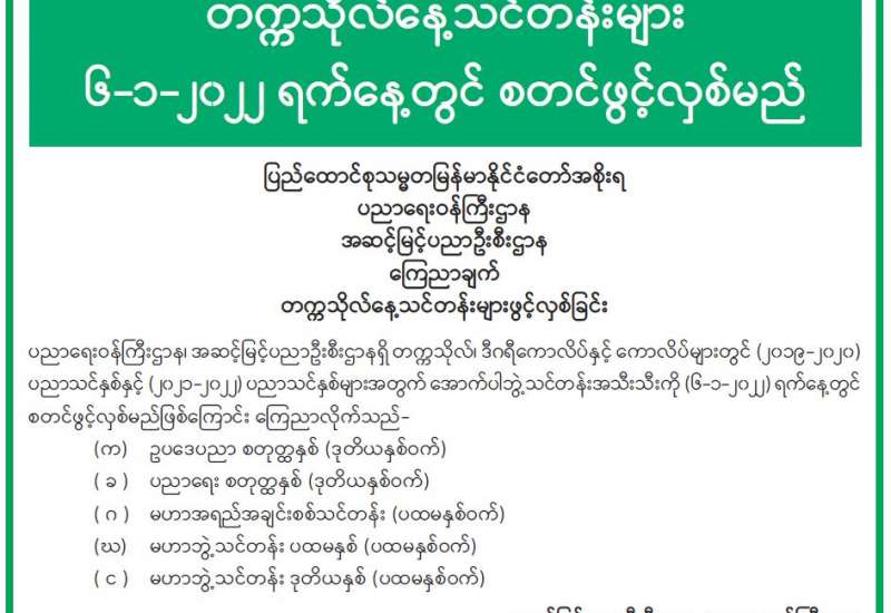 တက္ကသိုလ်နေ့သင်တန်းများ ၆-၁-၂၀၂၂ ရက်နေ့တွင် စတင်ဖွင့်လှစ်မည်