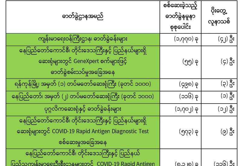 ကျန်းမာရေးဝန်ကြီးဌာနအနေဖြင့် နိုင်ငံအတွင်း ကူးစက်ဖြစ်ပွားနေသော COVID-19 ရောဂါ ကာကွယ်၊ ကုသ၊ ထိန်းချုပ်ရေးလုပ်ငန်းများကို အရှိန်အဟုန်မြှင့် ဆောင်ရွက်လျက်ရှိပါသည်။