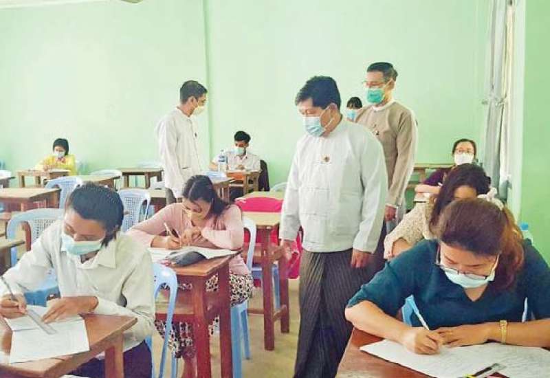 ဆောက်လုပ်ရေးဝန်ကြီးဌာန၊ မြို့ပြနှင့်အိမ်ရာ ဖွံ့ဖြိုးရေးဦးစီးဌာနတွင် လစ်လပ်လျက်ရှိသော ဒုတိယဦးစီးမှူး၊ အငယ်တန်းအင်ဂျင်နီယာ (၂)၊ ပုံဆွဲ (၂) နှင့် စာရင်းကိုင် (၂) ရာထူးအလွှာ ၈၃ နေရာ ရွေးချယ်ခန့်ထားနိုင်ရေးအတွက် သတင်းစာတွင် ကြော်ငြာထည့်သွင်း လျှောက်လွှာခေါ်ယူခဲ့သော ရေးဖြေစာမေးပွဲကို ယနေ့နံနက်ပိုင်းက နေပြည်တော်ကောင်စီနယ်မြေရှိ အမှတ်(၅) အခြေခံပညာ အထက်တန်းကျောင်း၌ ကိုဗစ်-၁၉ စည်းကမ်းချက်များနှင့်အညီ ကျင်းပရာ ဒုတိယဝန်ကြီး ဦးမင်းထိန်နှင့် တာဝန်ရှိသူများသည် ရေးဖြေစာမေးပွဲဖြေဆိုနေမှုကို လှည့်လည် ကြည့်ရှုအားပေးသည်။