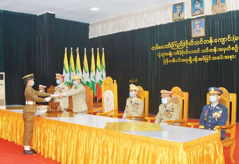 တပ်မတော်၏ အမျိုးသမီးစစ်မှုထမ်းများ၏ အခန်းကဏ္ဍကို အားသစ်လောင်းမည့် ဘွဲ့ရ အမျိုးသမီးဗိုလ်လောင်းသင်တန်း အမှတ်စဉ်(၈) သင်တန်းဆင်းဂုဏ်ပြု စစ်ရေးပြ အခမ်းအနား ကို ယနေ့နံနက်ပိုင်းတွင် ရန်ကုန်မြို့ရှိ တပ်မတော် (ကြည်း) ဗိုလ်သင်တန်းကျောင်း (မှော်ဘီ) စစ်ရေးပြကွင်း၌ ကျင်းပပြုလုပ်ရာ နိုင်ငံတော်စီမံ အုပ်ချုပ်ရေးကောင်စီဥက္ကဋ္ဌ တပ်မတော် ကာကွယ်ရေးဦးစီးချုပ် ဗိုလ်ချုပ်မှူးကြီး မဟာသရေစည်သူ မင်းအောင်လှိုင် တက်ရောက် မိန့်ခွန်း ပြောကြားသည်။