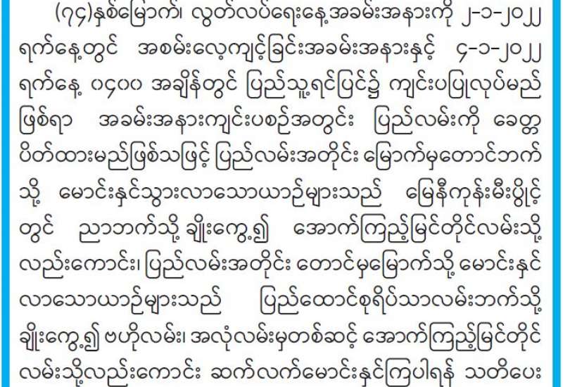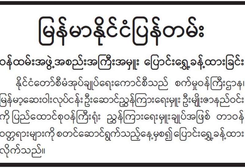 ပြည်ထောင်စုသမ္မတမြန်မာနိုင်ငံတော်သည် ကချင်၊ ကယား၊ ကရင်၊ ချင်း၊ မွန်၊ ဗမာ၊ ရခိုင်၊ ရှမ်း အစရှိသည့်တိုင်းရင်းသားလူမျိုးများ၏ စည်းလုံးမှုစွမ်းအား၊ ညီညွတ်မှုစွမ်းအား၊ အမျိုးကိုချစ်သော စိတ်ဓာတ်၊ အမိမြေကိုချစ်သောစိတ်ဓာတ်တို့ဖြင့် ဖွဲ့စည်းတည်ဆောက်ထားသောနိုင်ငံဖြစ်ပေသည်။ မြန်မာနိုင်ငံသည် တိုင်းရင်းသားလူမျိုးများ အေးချမ်းစွာဖြင့် ချစ်ခင်စည်းလုံးနေထိုင်ခဲ့ကြရာမှ ၁၈၈၅ ခုနှစ်တွင် လွတ်လပ်ရေးဆုံးရှုံးပြီး သူ့ကျွန်ဘဝသို့ ကျရောက်ခဲ့ရပေသည်။