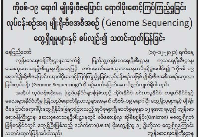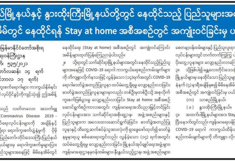 ကိုဗစ်-၁၉ ရောဂါ ကာကွယ်၊ ထိန်းချုပ်၊ ကုသရေးဆောင်ရွက်ရာတွင် ကာကွယ်ဆေးထိုးနှံခြင်း သည် အဓိကအခန်းကဏ္ဍတွင် ပါဝင်သည့် လုပ်ငန်းတစ်ရပ် ဖြစ်သောကြောင့် တိုင်းဒေသကြီးနှင့် ပြည်နယ်အသီးသီးတို့၌ သံဃာတော်များ၊ သာသနာနွယ်ဝင်သီလရှင်များ၊ ဘာသာရေး ခေါင်းဆောင်များအပါအဝင် လူမျိုးမရွေး ဘာသာမရွေး အသက် ၄၀ နှစ်အထက် ဒေသခံ ပြည်သူများ၊ အကျဉ်းသား၊ အကျဉ်းသူများ၊ မသန်စွမ်းသူများ၊ တိုင်းရင်းသားလက်နက်ကိုင် အဖွဲ့များ၊ နာတာရှည်ရောဂါအခံရှိသူများ၊ ကယ်ဆယ်ရေးစခန်းများ၊ ယာယီတိုက်ပွဲရှောင် စခန်းများအတွင်းရှိ ပြည်သူများ၊ အသက်(၁၂)နှစ်အထက် အခြေခံပညာအလယ်တန်းနှင့် အထက်တန်းအဆင့် ကျောင်းသား၊ ကျောင်းသူများစသည့် ဦးတည်အုပ်စုများသတ်မှတ်၍ တပ်မတော်မှ ဆေးအဖွဲ့များ၊ ပြည်သူ့ဆေးရုံများမှ ဆရာဝန်များ၊ သူနာပြုများ၊ ကျန်းမာရေး ဝန်ထမ်းများနှင့် စေတနာ့ဝန်ထမ်းများက ကာကွယ်ဆေးထိုးခြင်းလုပ်ငန်းများကို အင်တိုက် အားတိုက် ဆောင်ရွက်ပေးလျက်ရှိသည်။