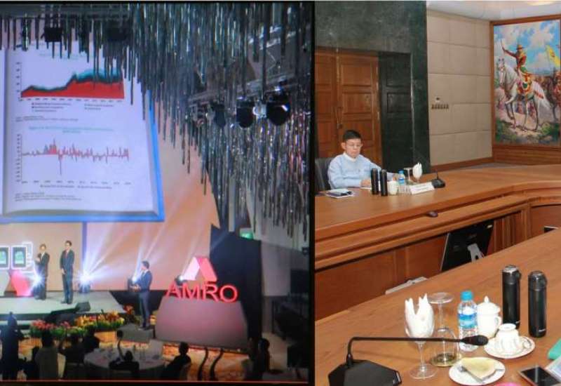 အာဆီယံ+၃ မေခရိုစီးပွားရေးသုတေသနရုံး (ASEAN +3 Macroeconomic Research Office-AMRO) မှ ကြီးမှူးကျင်းပသည့် အာဆီယံ+၃ မေခရို စီးပွားရေး သုတေသနရုံး တည်ထောင်ခြင်း (၁၀) နှစ်ပြည့် နှစ်ပတ်လည်အခမ်းအနား (AMRO’s 10th Anniversary Celebration Event) ကို ယနေ့မွန်းလွဲပိုင်းတွင် ဗီဒီယိုကွန်ဖရင့်စနစ်ဖြင့် ကျင်းပရာ မြန်မာနိုင်ငံတော်ဗဟိုဘဏ်ဥက္ကဋ္ဌ ဦးသန်းညိန်း၊ ဒုတိယဥက္ကဋ္ဌများဖြစ်ကြသော ဦးဝင်းသော်၊ ဒေါ်သန်းသန်းဆွေနှင့် မြန်မာနိုင်ငံ တော်ဗဟိုဘဏ်မှ တာဝန်ရှိသူများ တက်ရောက်ကြသည်။