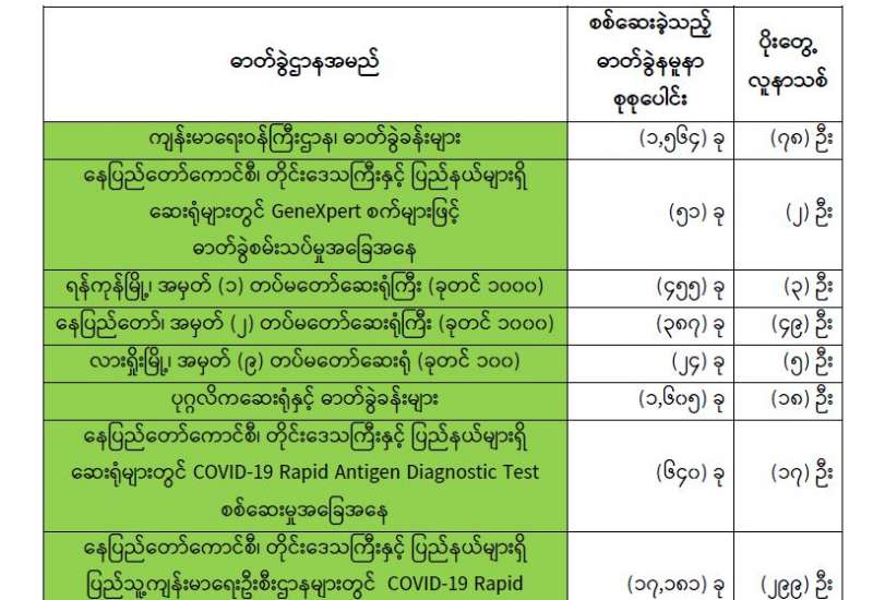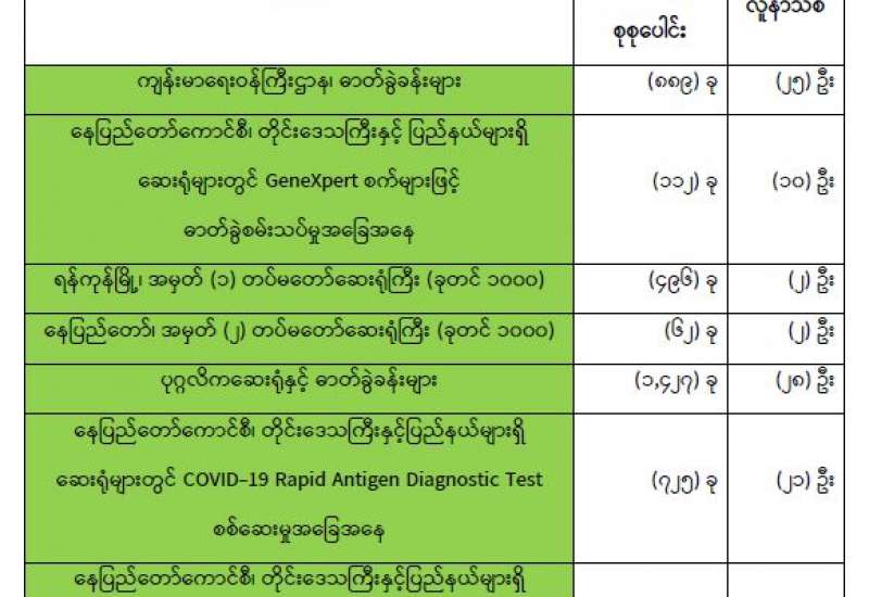ကျန်းမာရေးဝန်ကြီးဌာနအနေဖြင့် နိုင်ငံအတွင်း ကူးစက်ဖြစ်ပွားနေသော COVID-19 ရောဂါ ကာကွယ်၊ ကုသ၊ ထိန်းချုပ်ရေးလုပ်ငန်းများကို အရှိန်အဟုန်မြှင့်ဆောင်ရွက်လျက်ရှိပါသည်။