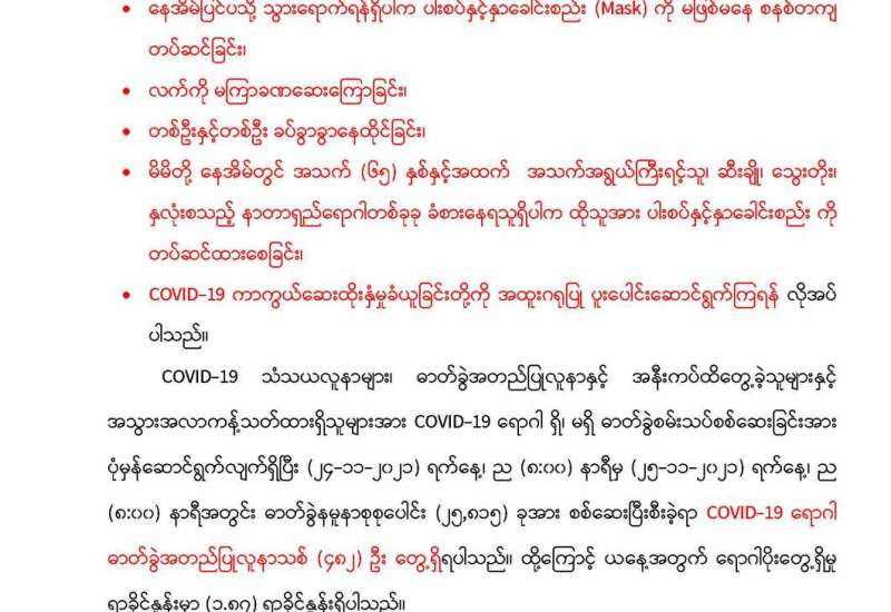 စီးပွားရေးနှင့် ကူးသန်းရောင်းဝယ်ရေးဝန်ကြီးဌာန အနေဖြင့် ကိုဗစ်-၁၉ ရောဂါကာကွယ်၊ ထိန်းချုပ်၊ ကုသရေးဆိုင်ရာ ပစ္စည်းများကို လေကြောင်း၊ ရေကြောင်းနှင့် နယ်စပ်ကုန်သွယ်ရေးစခန်း များမှ နှောင့်နှေးကြန့်ကြာမှုမရှိ တင်သွင်းနိုင်ရေးအတွက် အချိန်နှင့်တစ်ပြေးညီ စီစဉ်ဆောင်ရွက်ပေးလျက်ရှိရာ ယနေ့တွင် ချင်းရွှေဟော် ကုန်သွယ်ရေးစခန်း၊ ကျိုင်းတုံကုန်သွယ်ရေး စခန်းနှင့် မြဝတီကုန်သွယ်ရေးဇုန်တို့မှ ကုမ္ပဏီ(၄)ခု၊ ယာဉ်စီးရေ (၆)စီးတို့ဖြင့် တင်သွင်းရာ၌ အောက်ဆီဂျင်အရည် Bowser ယာဉ်(၁)စီးဖြင့် (၂၀)တန်နှင့် နှာခေါင်းစည်း(Mask)(၃၄)တန်တို့ကို တင်သွင်းခဲ့သည်။ အောက်ဆီဂျင်အရည် (Bowser) ယာဉ် (၁) စီးမှာ မြဝတီကုန်သွယ်ရေးဇုန်မှ ရန်ကုန်မြို့သို့ ဖြစ်ကြောင်း သိရှိရသည်။