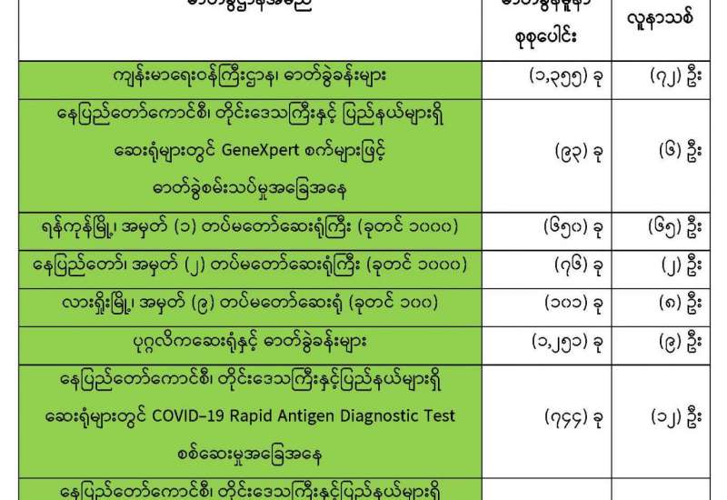 ကျန်းမာရေးဝန်ကြီးဌာနအနေဖြင့် နိုင်ငံအတွင်း ကူးစက်ဖြစ်ပွားနေသော COVID-19 ရောဂါ ကာကွယ်၊ ကုသ၊ ထိန်းချုပ်ရေးလုပ်ငန်းများကို အရှိန်အဟုန်မြှင့်ဆောင်ရွက်လျက်ရှိရာ ရောဂါ ထိန်းချုပ်ရေးလုပ်ငန်းများ အောင်မြင်နိုင်ရေးအတွက် ပြည်သူလူထုအနေဖြင့် ကျန်းမာရေးဝန်ကြီး ဌာနမှထုတ်ပြန်ထားသော COVID-19 ရောဂါကာကွယ်ထိန်းချုပ်ရေးဆိုင်ရာစည်းကမ်းများကို စနစ် တကျ လိုက်နာဆောင်ရွက်ရန်လိုအပ်ပြီး COVID-19 ကာကွယ်ဆေးထိုးနှံမှုခံယူခြင်းအား အထူး ဂရုပြု ပူးပေါင်းဆောင်ရွက်ကြရန် လိုအပ်ပါသည်။