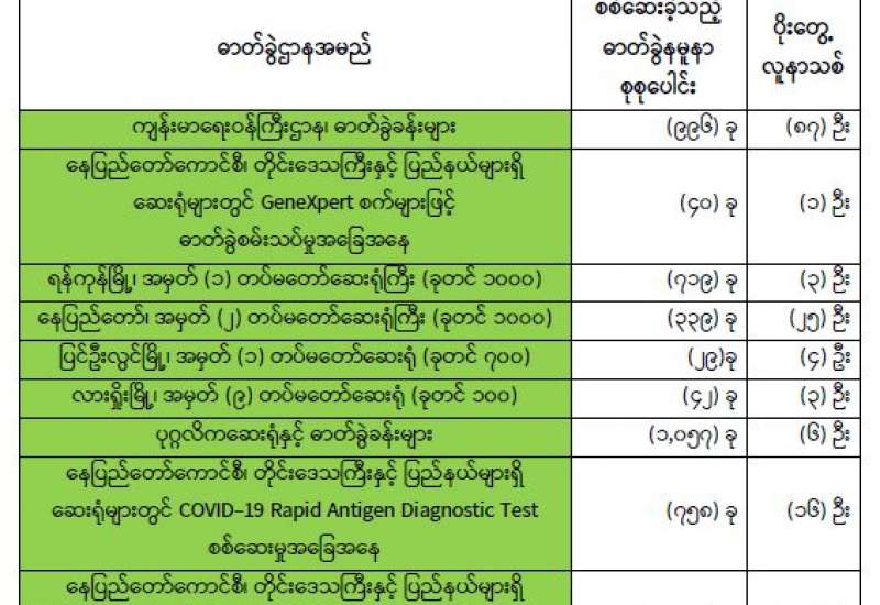 စီးပွားရေးနှင့် ကူးသန်းရောင်းဝယ်ရေး ဝန်ကြီးဌာနအနေဖြင့် ကိုဗစ်-၁၉ ရောဂါ ကာကွယ်၊ ထိန်းချုပ်၊ ကုသရေးဆိုင်ရာ ပစ္စည်းများ ကို လေကြောင်း၊ ရေကြောင်းနှင့် နယ်စပ်ကုန်သွယ်ရေးစခန်း များမှ နှောင့်နှေးကြန့်ကြာမှုမရှိ တင်သွင်းနိုင်ရေးအတွက် အချိန်နှင့် တစ်ပြေးညီ စီစဉ်ဆောင်ရွက်ပေးလျက်ရှိရာ ယနေ့တွင် ရန်ကုန်အပြည်ပြည်ဆိုင်ရာ ဆိပ်ကမ်းနှင့် မြဝတီ ကုန်သွယ်ရေး ဇုန်တို့မှ တင်သွင်းရာ၌ကုမ္ပဏီ(၁)ခု ယာဉ်စီးရေ(၁)စီးဖြင့် အောက်ဆီဂျင်(အရည်) Bowser ယာဉ်(၁) စီးဖြင့် တန် (၂၀) ၊ အောက်ဆီဂျင် (အိုးခွံ) (၁၄၁၀)၊ အောက်ဆီဂျင်(Plant) (၉) ခုနှင့် လက်အိတ်(၆)တန် တို့ကို တင်သွင်းခဲ့သည်။ အောက်ဆီဂျင် (အရည်) Bowser ယာဉ်(၁)စီးမှာ မြဝတီကုန်သွယ်ရေးဇုန်မှ ရန်ကုန်မြို့သို့ဖြစ်ပြီး အောက်ဆီဂျင် (Plant) (၉) ခုမှာ ဆိပ်ကမ်းမှ ရန်ကုန်မြို့သို့ ဖြစ်ကြောင်း သိရသည်။