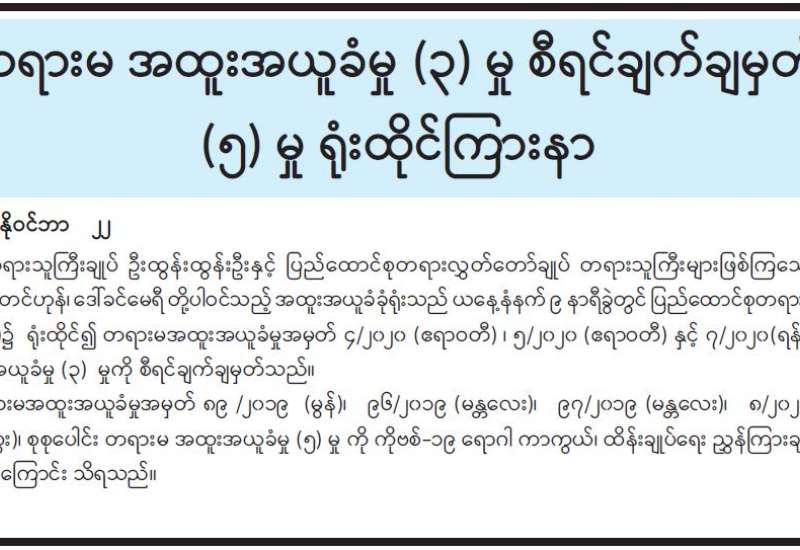 ပြည်သူ့ဘဏ္ဍာရေးစီမံခန့်ခွဲမှု အထူးမွမ်းမံသင်တန်း အမှတ်စဉ် (၁) ဖွင့်ပွဲအခမ်းအနားကို ယနေ့နံနက် ၈ နာရီခွဲ၌ စီမံကိန်းနှင့်ဘဏ္ဍာရေးဝန်ကြီးဌာနလက်အောက်ရှိ ရသုံးမှန်းခြေ ငွေစာရင်းဦးစီးဌာန၏ ပြည်သူ့ဘဏ္ဍာရေး စီမံခန့်ခွဲမှုသင်တန်းကျောင်းတွင် ကိုဗစ် -၁၉ ရောဂါ ကာကွယ်ထိန်းချုပ်ရေး စည်းကမ်းသတ်မှတ်ချက်များနှင့်အညီ ကျင်းပသည်။
