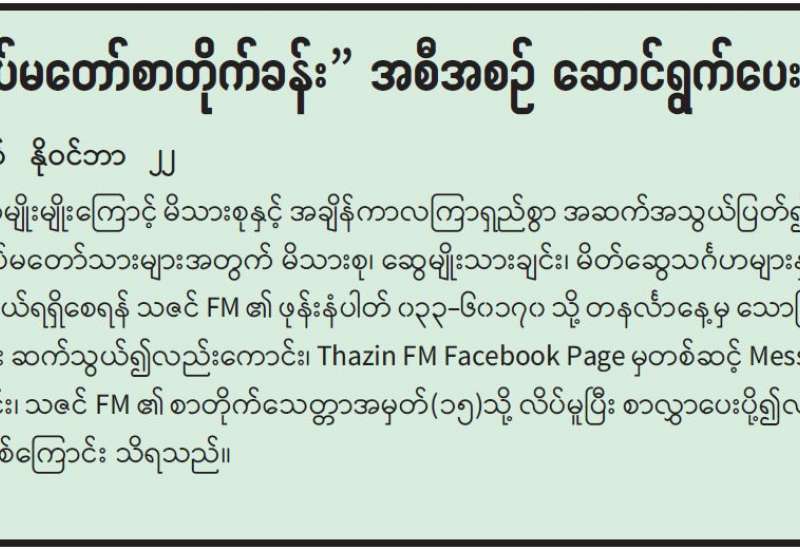 မန္တလေးမြို့ နန်းရှေ့ရှိမြမန္တလာစာပေပန်းခင်း စာကြည့်တိုက်သို့ ရှားပါး သုတ၊ ရသ စာအုပ်လှူဒါန်းပွဲကို နိုဝင်ဘာ ၂၁ ရက် နံနက် ၁၁ နာရီက အဆိုပါ စာကြည့်တိုက်၌ ကျင်းပသည်။