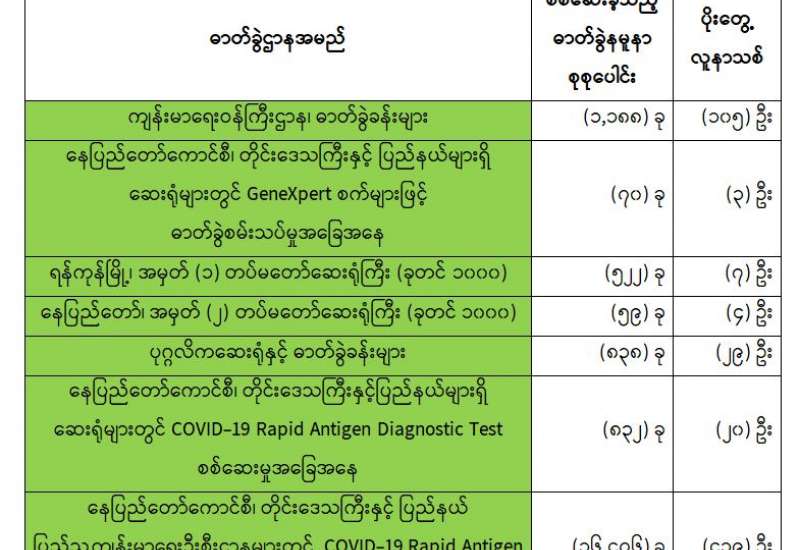 စီးပွားရေးနှင့် ကူးသန်းရောင်းဝယ် ရေးဝန်ကြီးဌာနအနေဖြင့် ကိုဗစ်၁၉ရောဂါ ကာကွယ်၊ ထိန်းချုပ်၊ ကုသရေးဆိုင်ရာ ပစ္စည်းများကို လေကြောင်း၊ ရေကြောင်းနှင့် နယ်စပ်ကုန်သွယ်ရေးစခန်းများမှ နှောင့်နှေးကြန့်ကြာမှုမရှိ တင်သွင်းနိုင်ရေးအတွက် အချိန်နှင့်တစ်ပြေးညီ စီစဉ်ဆောင်ရွက်ပေး လျက်ရှိရာ ယနေ့တွင် မြဝတီ၊ ချင်းရွှေဟော်နှင့် ကန်ပိုက်တီ ကုန်သွယ်ရေးစခန်း သုံးခုတို့မှ တင်သွင်းရာ၌ ကုမ္ပဏီနှစ်ခုမှ ယာဉ်စီးရေလေးစီးဖြင့် အောက်ဆီဂျင်(အရည်)Bowser ယာဉ်တစ်စီး ဖြင့် တန် ၂၀၊ PPE ဝတ်စုံ ၄၄၀ နှင့် နှာခေါင်းစည်း (Mask) ၁၄ တန်တို့ကို တင်သွင်းခဲ့သည်။ အောက်ဆီဂျင်(အရည်)Bowser ယာဉ်တစ်စီးမှာ မြဝတီစခန်းမှ ရန်ကုန်မြို့သို့ ဖြစ်ကြောင်း သိရှိရသည်။