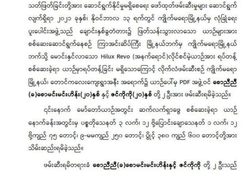 စီးပွားရေးနှင့် ကူးသန်းရောင်းဝယ်ရေးဝန်ကြီးဌာန အနေဖြင့် ကိုဗစ်-၁၉ ရောဂါ ကာကွယ်၊ ထိန်းချုပ်၊ ကုသရေးဆိုင်ရာ ပစ္စည်းများကို လေကြောင်း၊ ရေကြောင်းနှင့် နယ်စပ်ကုန်သွယ်ရေး စခန်းများမှ နှောင့်နှေးကြန့်ကြာမှုမရှိ တင်သွင်းနိုင်ရေး အချိန်နှင့် တစ်ပြေးညီ စီစဉ်ဆောင်ရွက်ပေး လျက်ရှိရာ ယနေ့တွင် မြဝတီနှင့် ချင်းရွှေဟော်ကုန်သွယ်ရေးစခန်းတို့မှ တင်သွင်းရာ၌ ကုမ္ပဏီနှစ်ခုမှ ယာဉ်စီးရေ သုံးစီးဖြင့် အောက်ဆီဂျင်(အရည်) Bowser ယာဉ် တစ်စီးဖြင့် တန် ၂၀ နှင့် နှာခေါင်းစည်း (Mask) ၁၆ တန်တို့ကို တင်သွင်းခဲ့သည်။ မြဝတီကုန်သွယ်ရေးဇုန်မှတင်သွင်းသည့် အောက်ဆီဂျင် (အရည်) Bowser ယာဉ်တစ်စီး မှာ ရန်ကုန်မြို့သို့ဖြစ်ကြောင်း သိရှိရသည်။