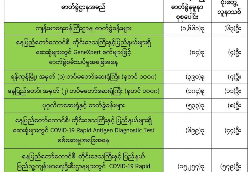 ကျန်းမာရေးဝန်ကြီးဌာနအနေဖြင့် နိုင်ငံအတွင်း ကူးစက်ဖြစ်ပွားနေသော COVID-19 ရောဂါ ကာကွယ်၊ ကုသ၊ ထိန်းချုပ်ရေးလုပ်ငန်းများကို အရှိန်အဟုန်မြှင့်ဆောင်ရွက်လျက်ရှိရာ ရောဂါ ထိန်းချုပ်ရေးလုပ်ငန်းများ အောင်မြင်နိုင်ရေးအတွက် ပြည်သူလူထုအနေဖြင့် ကျန်းမာရေးဝန်ကြီး ဌာနမှ ထုတ်ပြန်ထားသော COVID-19 ရောဂါကာကွယ်ထိန်းချုပ်ရေးဆိုင်ရာ စည်းကမ်းများကို စနစ်တကျ လိုက်နာဆောင်ရွက်ရန်လိုအပ်ပြီး COVID-19 ကာကွယ်ဆေးထိုးနှံမှုခံယူခြင်းအား အထူး ဂရုပြု ပူးပေါင်းဆောင်ရွက်ကြရန် လိုအပ်ပါသည်။