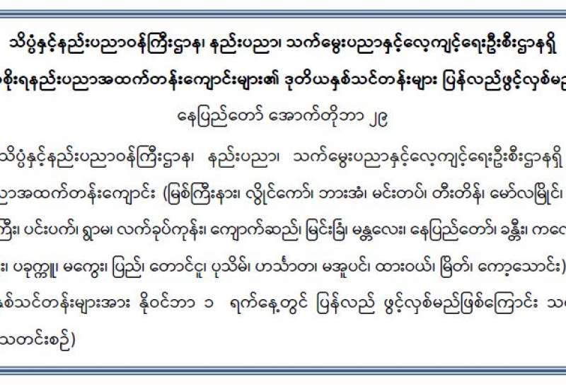 စိုက်ပျိုး၊ မွေးမြူရေးကိုအခြေခံသော အသက်မွေးဝမ်းကျောင်းပညာရပ် ကျွမ်းကျင်သူများ၊ အဆင့်မြင့်ပညာရှင်များ တိုးပွားလာရေးကို အရေးကြီးသော လုပ်ငန်းရပ်တစ်ခုအဖြစ် အကောင်အထည်ဖော် ဆောင်ရွက်လျက်ရှိရာ နိုင်ငံအတွက်လိုအပ်လျက်ရှိသော ငါးလုပ်ငန်း သိပ္ပံကျောင်းသစ် တည်ထောင်ဖွင့်လှစ်နိုင်ရေး ဆောင်ရွက်သွားမည်ဖြစ်ကြောင်း၊ ယနေ့ ကျင်းပ သည့် ငါးလုပ်ငန်းသိပ္ပံကျောင်းသစ် တည်ထောင်ဖွင့်လှစ်နိုင်ရေး လုပ်ငန်းညှိနှိုင်းအစည်းအဝေးတွင် စိုက်ပျိုးရေး၊ မွေးမြူရေးနှင့် ဆည်မြောင်းဝန်ကြီးဌာန ပြည်ထောင်စုဝန်ကြီး ဦးတင်ထွဋ်ဦး က ဆွေးနွေးပြောကြားသည်။