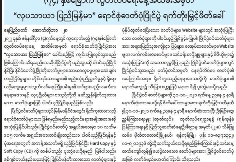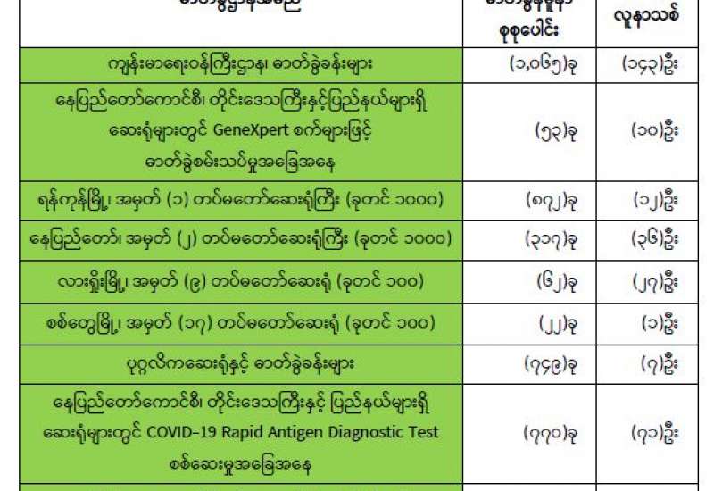 ကျန်းမာရေးဝန်ကြီးဌာနအနေဖြင့် နိုင်ငံအတွင်း ကူးစက်ဖြစ်ပွားနေသော COVID-19 ရောဂါ ကာကွယ်၊ ကုသ၊ ထိန်းချုပ်ရေးလုပ်ငန်းများကို အရှိန်အဟုန်မြှင့်ဆောင်ရွက်လျက်ရှိရာ ရောဂါ ထိန်းချုပ်ရေးလုပ်ငန်းများ အောင်မြင်နိုင်ရေးအတွက် ပြည်သူလူထုအနေဖြင့် ကျန်းမာရေး ဝန်ကြီးဌာနမှ ထုတ်ပြန်ထားသော COVID-19 ရောဂါ ကာကွယ်ထိန်းချုပ်ရေးဆိုင်ရာ စည်းကမ်း များကို စနစ်တကျ လိုက်နာဆောင်ရွက်ရန်လိုအပ်ပြီး COVID-19 ကာကွယ်ဆေးထိုးနှံမှု ခံယူခြင်းအား အထူးဂရုပြု ပူးပေါင်းဆောင်ရွက်ကြရန် လိုအပ်ပါသည်။