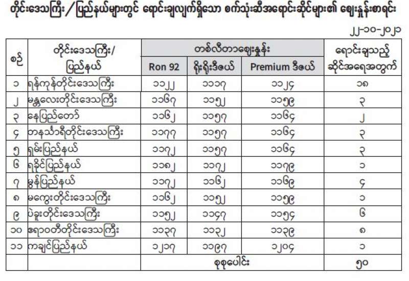 စီးပွားရေးနှင့် ကူးသန်းရောင်းဝယ်ရေးဝန်ကြီးဌာနနှင့် မြန်မာနိုင်ငံ စက်သုံးဆီတင်သွင်း ဖြန့်ဖြူး ရောင်းချရေးအသင်းတို့ ပူးပေါင်းစီစဉ်မှုဖြင့် ပြည်သူများသက်သာသောဈေးနှုန်းဖြင့် ဝယ်ယူ ရရှိနိုင်ရန် ရည်ရွယ်၍ ဗဟိုဘဏ်မှ ရည်ညွှန်း ငွေလဲနှုန်းဖြင့် တိုက်ရိုက်ရောင်းချပေးသည့် နိုင်ငံ ခြားငွေဖြင့် မှာယူတင်သွင်းခဲ့သည့် စက်သုံးဆီများကို ယနေ့မှစတင်၍ တိုင်းဒေသကြီး/ ပြည်နယ်များရှိ စက်သုံးဆီအရောင်းဆိုင် ၅၀ တွင် 92 Ron ၁၉၆၇၀၆၅၂ လီတာ၊ ဒီဇယ် ၁၂၂၀၅၉၀၆ လီတာနှင့် Premium ဒီဇယ် ၁၈၃၄၇၁၀၁ လီတာတို့ ဖြန့်ဖြူး ရောင်းချ ပေးထားပြီးဖြစ်သည်။
