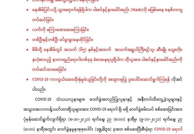 ကူးစက်မြန်ဗီဇပြောင်း ကိုရိုနာဗိုင်းရပ်စ်များ ကမ္ဘာအနှံ့နိုင်ငံအသီးသီး တို့တွင် အရှိန်အဟုန်ဖြင့် ဆက်လက်ပြန့်ပွား လျက်ရှိစဉ် မိမိတို့နိုင်ငံ ၌သိသိသာသာလျော့နည်းကျဆင်းလာခဲ့သည်မှာ ဝမ်းမြောက်ဖွယ်ရာ ပင်ဖြစ်သည်။ သို့ရာတွင် စိတ်ချရလောက်သည့် အခြေအနေသို့ မရောက်ရှိသေးဘဲ နေ့စဉ်ရောဂါပိုးကူးစက်မှု တွေ့ရှိရသည့် နှုန်းမှာ ၇ ရာခိုင်နှုန်းနှင့် ၈ ရာခိုင်နှုန်းတို့၏ဝန်းကျင်တွင် တရစ်ဝဲဝဲဖြစ်နေသည်။ ရောဂါပိုးကူးစက်မှု ၅ ရာခိုင်နှုန်းအောက်သို့ ဆက်လက်ကျဆင်းလျော့နည်းသွားရန် လူတိုင်းအသိကိုယ်စီဖြင့် ကြိုးပမ်းကြရ ဦးမည်ဖြစ်သည်။