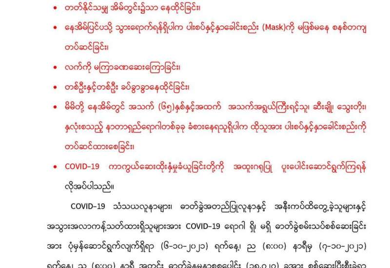 အကောက်ခွန်ဦးစီးဌာနအနေဖြင့် ကိုဗစ်-၁၉ ရောဂါ ကာကွယ်၊ ထိန်းချုပ်၊ ကုသရေးဆေးနှင့် ပစ္စည်းများအား လေကြောင်း၊ ဆိပ်ကမ်း၊ နယ်စပ်ဂိတ်အသီးသီးမှ နေ့စဉ်လွယ်ကူချောမွေ့စွာ စစ်ဆေးထုတ်ပေး လျက်ရှိသည်။