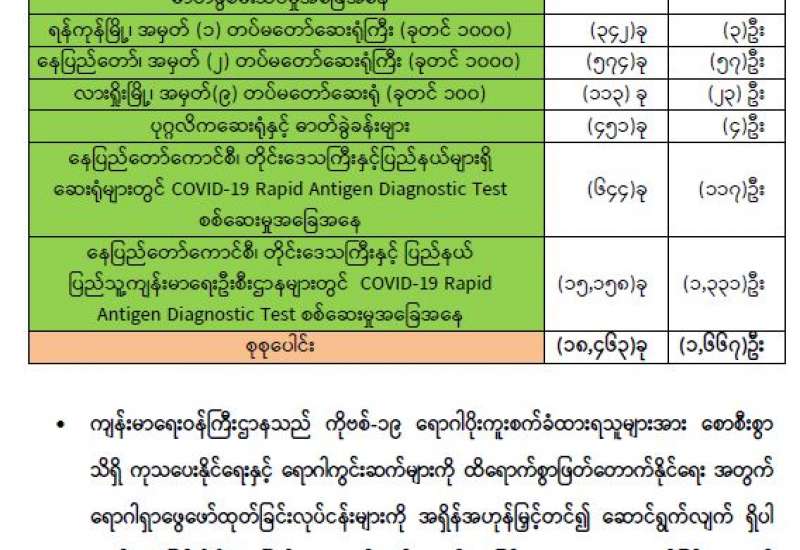 ကျန်းမာရေးဝန်ကြီးဌာနအနေဖြင့် နိုင်ငံအတွင်း ကူးစက်ဖြစ်ပွားနေသော COVID-19 ရောဂါ ကာကွယ်၊ ကုသ၊ ထိန်းချုပ်ရေး လုပ်ငန်းများကို အရှိန်အဟုန်မြှင့်ဆောင်ရွက်လျက်ရှိရာ ရောဂါ ထိန်းချုပ်ရေးလုပ်ငန်းများ အောင်မြင်နိုင်ရေးအတွက် ပြည်သူလူထု အနေဖြင့် ကျန်းမာရေး ဝန်ကြီးဌာနမှ ထုတ်ပြန်ထားသော COVID-19 ရောဂါကာကွယ်ထိန်းချုပ်ရေးဆိုင်ရာ စည်းကမ်း များကို စနစ်တကျ လိုက်နာဆောင်ရွက်ရန်လိုအပ်ပြီး COVID-19 ကာကွယ်ဆေးထိုးနှံမှု ခံယူခြင်းအား အထူးဂရုပြု ပူးပေါင်းဆောင်ရွက် ကြရန် လိုအပ်ပါသည်။