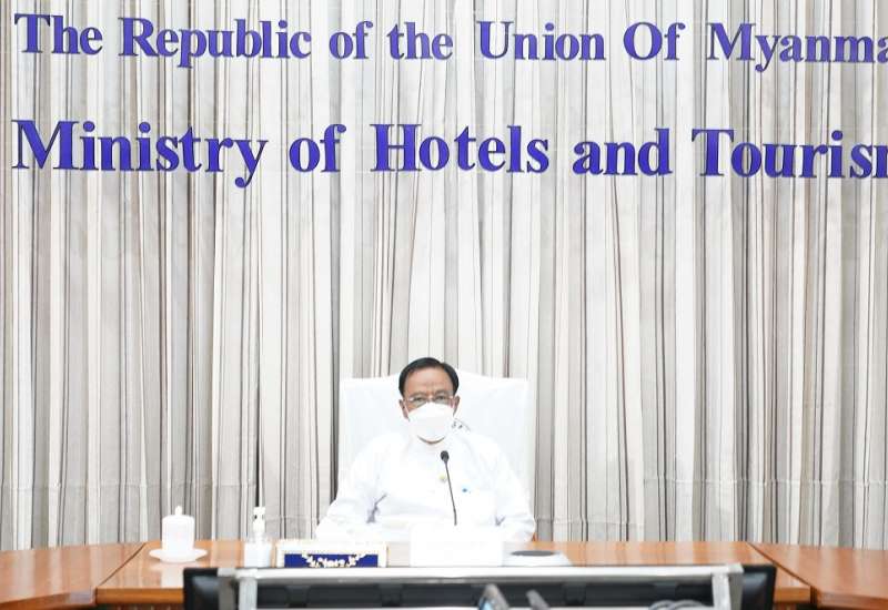 ဟိုတယ်နှင့်ခရီးသွားလာရေးဝန်ကြီးဌာန၊ ပြည်ထောင်စုဝန်ကြီး ဒေါက်တာဌေးအောင်သည် ကမ္ဘာ့ခရီးသွားလုပ်ငန်းနေ့ (၂၀၂၁) အထိမ်းအမှတ်အခမ်းအနား အောင်မြင်စွာကျင်းပနိုင်ရေး အပြီးသတ် စီစဉ်ဆောင်ရွက်ထားရှိမှုများနှင့်စပ်လျဉ်း၍ လုပ်ငန်းညှိနှိုင်း အစည်းအဝေးကို ယနေ့ မွန်းလွဲပိုင်းက ဗီဒီယိုကွန်ဖရင့်စနစ်ဖြင့် ဝန်ကြီးဌာန နီလာအစည်းအဝေးခန်းမ၌ ကျန်းမာရေး ဝန်ကြီးဌာနမှ ထုတ်ပြန်ထားရှိသည့် ကိုဗစ်-၁၉ ရောဂါကာကွယ်၊ ထိန်းချုပ်ရေးဆိုင်ရာ ညွှန်ကြားချက်များနှင့်အညီ ကျင်းပသည်။