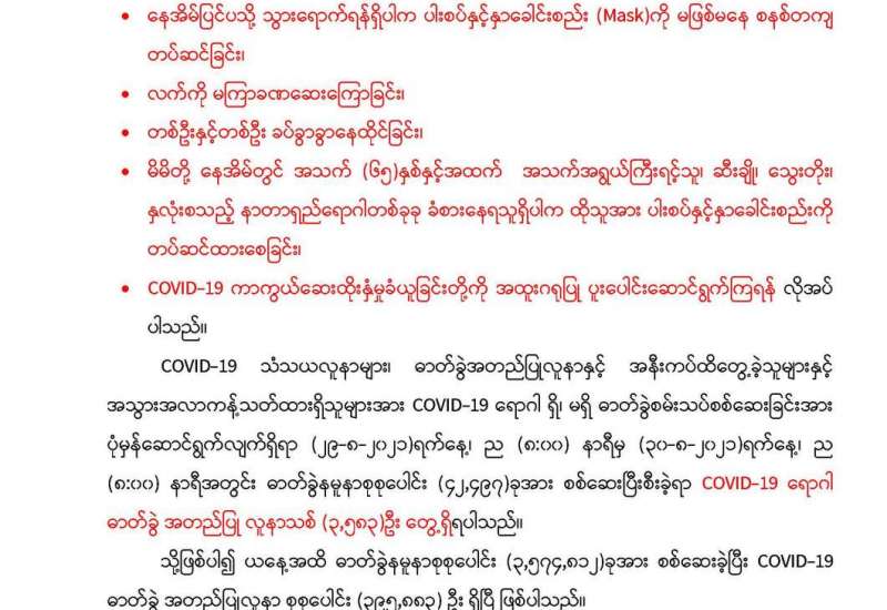 စီးပွားရေးနှင့် ကူးသန်းရောင်းဝယ်ရေးဝန်ကြီးဌာနအနေဖြင့် နိုင်ငံတော်အတွင်း၌ ကိုဗစ်-၁၉ ရောဂါ ကာကွယ်၊ ထိန်းချုပ်၊ ကုသရေး လုပ်ငန်းများအတွက် လိုအပ်သည့် အောက်ဆီဂျင်အရည်၊ အောက်ဆီဂျင်ဓာတ်ငွေ့၊ အိမ်သုံးအောက်ဆီဂျင်စက်၊ ဆေးဝါးနှင့် ဆက်စပ်ပစ္စည်းများကို အများပြည်သူ အလုပ်ပိတ်ရက်အဖြစ် သတ်မှတ်ကြေညာထားသည့် ဩဂုတ် ၂၃ ရက်မှ ၃၁ ရက် အတွင်း၌လည်း လေကြောင်း၊ ရေကြောင်းနှင့် နယ်စပ်ကုန်သွယ်ရေးစခန်းများမှ စဉ်ဆက်မပြတ် တင်သွင်းနိုင်ရေးအတွက် စီစဉ် ဆောင်ရွက်ပေးလျက်ရှိသည်။