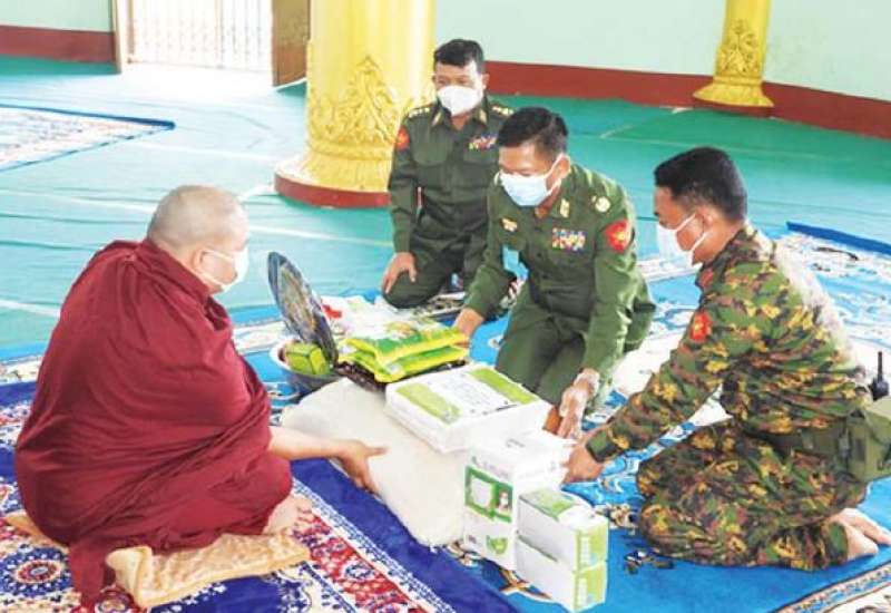 တပ်မတော်(ကြည်း၊ရေ၊လေ) အရာရှိ၊ စစ်သည်၊ အရာထမ်း၊ အမှုထမ်းများနှင့် စေတနာရှင်အလှူရှင်များက ကိုဗစ်-၁၉ ရောဂါ ကြိုတင်ကာကွယ်ရေးလုပ်ငန်းများ ဆောင်ရွက်နေသည့် ကာလအတွင်း ဆွမ်းကိစ္စရပ်များ အဆင်ပြေစေရန်ရည်ရွယ်၍ မြို့နယ်အသီးသီးရှိ ဘုန်းတော်ကြီးကျောင်းများ၊ သာသနာ့နွယ်ဝင် သီလရှင်ကျောင်း များနှင့် ဘာသာရေးကျောင်းများတွင် ဆွမ်းဆန်တော်၊ ဆီ၊ ဆား၊ ပဲ အမယ်(၄)မျိုးနှင့် လှူဖွယ်ပစ္စည်းများလှူဒါန်းခြင်း၊ နေ့ဆွမ်းများ ဆက်ကပ်လှူဒါန်းခြင်းနှင့် ကျန်းမာရေး စစ်ဆေးပေးခြင်းများကို ဆောင်ရွက်လျက်ရှိသည်။