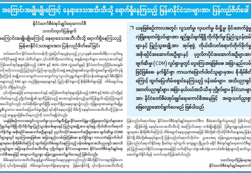NUG၊ CRPH အဖွဲ့တို့အား ထောက်ခံအားပေးသည့် အကြမ်းဖက်သူများ အနေဖြင့် ကိုဗစ်-၁၉ ကူးစက်ရောဂါ ကာကွယ်ထိန်းချုပ်ရေး လုပ်ငန်းစဉ်များကို ပျက်ပြားစေရန် အဖျက်အမှောက် လုပ်ငန်းများလုပ်ဆောင်ခြင်း၊ လုံခြုံရေး တပ်ဖွဲ့ဝင်များ၏ ပုံရိပ်ပျက်ပြားစေရန် နည်းမျိုးစုံအသုံးပြုကာ လုပ်ဆောင်လျက်ရှိသည်။