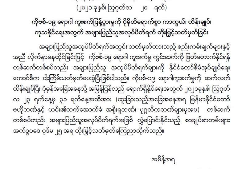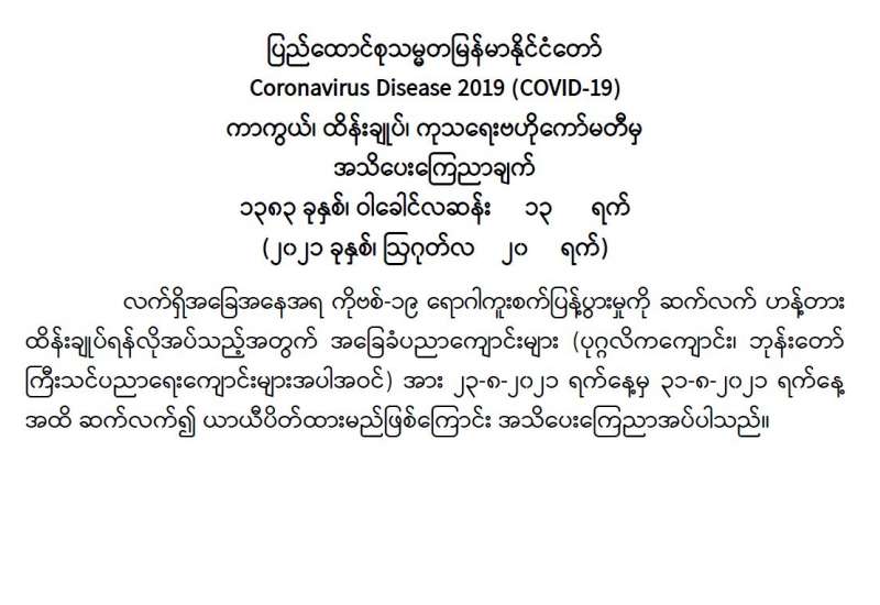 မြန်မာနိုင်ငံတွင် ကိုဗစ်-၁၉ တတိယလှိုင်း ကူးစက်မှုမြင့်မားနေချိန်တွင် နိုင်ငံတော် စီမံအုပ်ချုပ်ရေးကောင်စီအနေဖြင့် ပြည်သူလူထုနှင့်ပူးပေါင်း၍ ရောဂါကာကွယ် ထိန်းချုပ်၊ ကုသရေးလုပ်ငန်းများကို ဘက်ပေါင်းစုံမှ အစွမ်းကုန်ကြိုးပမ်းဆောင်ရွက် လျက်ရှိသည်။ မိဘပြည်သူများအနေဖြင့် ကိုဗစ်-၁၉ ကပ်ရောဂါကို စိုးရိမ်ပူပန်ကြ၍ ရောဂါကာကွယ်၊ ထိန်းချုပ်ရေးလုပ်ငန်းများတွင် တက်ကြွစွာပူးပေါင်းပါဝင်ဆောင်ရွက်လျက်ရှိရာ ယခုအခါ ရောဂါဖြစ်ပွားမှုများ တဖြည်းဖြည်းလျော့ကျလာသည်။