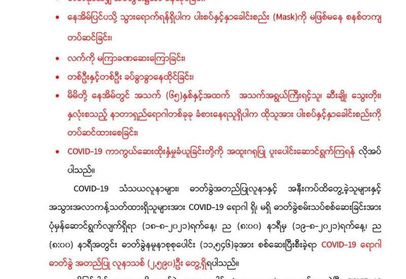 မြန်မာ့အသံနှင့် ရုပ်မြင်သံကြားမှ ဩဂုတ် ၁၈ ရက် ည ၈ နာရီ သတင်းအပြီးတွင် ထုတ်လွှင့်ပြသခဲ့သည့် ကိုဗစ်-၁၉ ရောဂါကာကွယ်ထိန်းချုပ်ရေးဆိုင်ရာ ဆောင်ရွက်ချက်များအကြောင်း သိကောင်းစရာ အစီအစဉ်ကို ပြည်သူများ သိရှိနိုင်ရန်အတွက် ပြန်လည်ဖော်ပြလိုက်ပါသည်။