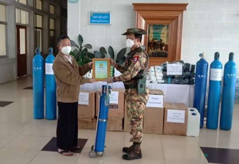 ကိုဗစ်-၁၉ ရောဂါဓာတ်ခွဲအတည်ပြု ပိုးတွေ့လူနာများနှင့် သီးသန့်စောင့် ကြည့်ရမည့်သူများကို ကုသရေးလုပ်ငန်းများ ဆောင်ရွက်ရာတွင် အောက်ဆီဂျင် လိုအပ်ချက်များကို တစ်ဖက်တစ်လမ်းမှ အထောက်အကူပြုစေရန်အတွက် တပ်မတော် နှင့် အလှူရှင်များက အောက်ဆီဂျင်အိုးများ၊ ရောဂါကာကွယ်ရေး အထောက် အကူပြုပစ္စည်းများနှင့် အာဟာရဖြည့်စားသောက်ဖွယ်ရာများကို တိုင်းဒေသကြီးနှင့် ပြည်နယ်အသီးသီးရှိ ပြည်သူ့ဆေးရုံများ၊ တပ်မတော်ဆေးရုံများ၊ ကျန်းမာရေးဌာနများ၊ ကိုဗစ်စင်တာများနှင့် လူမှုကူညီရေး အသင်းအဖွဲ့များသို့ ပေးပို့လှူဒါန်းလျက်ရှိသည်။