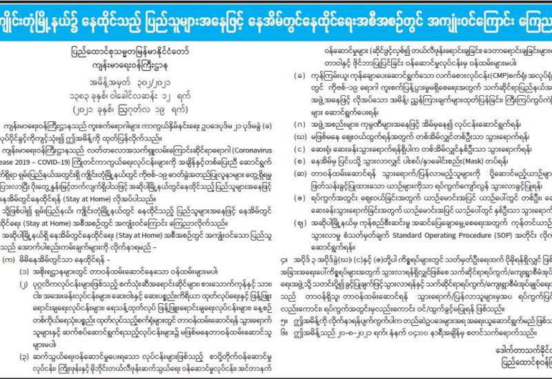 မြန်မာနိုင်ငံကိုဗစ်-၁၉ တတိယလှိုင်းတွင် မြို့နယ်အချို့ကို Stay at Home ချမှတ်ခဲ့ရပြီး ယနေ့ထိတိုင်လည်း Stay at Home မြို့နယ်များ လိုအပ်သလို သတ်မှတ်နေရဆဲဖြစ်သည်။ Stay at Home ခေါ် အိမ်မှာ သာနေရသည့် အစီအစဉ်ကို ချမှတ်ခြင်းမှာ ပြင်ပအသွားအလာများ လျော့ကျသွားစေရန်အတွက် ကန့်သတ်ထိန်းချုပ်ခြင်း ဖြစ်သည်။ ရရှိ လာမည့် အကျိုးရလဒ်မှာ လူတစ်ဦးနှင့်တစ်ဦး ထိတွေ့မှုလျှော့ချနိုင် ကာ ရောဂါကူးစက်ပျံ့နှံ့မှုလမ်းကြောင်းများ ပြတ်တောက်သွားခြင်း ဖြင့် ရောဂါကူးစက်မှုမြင့် တက်နေသည့်အခြေအနေကို တားဆီးနိုင် ခြင်းပင်ဖြစ်သည်။ လူဦးရေထူထပ်သော မြို့ကြီး များတွင် အများ ပြည်သူရုံးပိတ်ရက်ရှည် သတ်မှတ်ခြင်းနှင့် အိမ်မှာသာနေရမည့် အစီ အစဉ်ချ မှတ်ခြင်းတို့၏ အကျိုးကျေးဇူးကြောင့် ကပ်ရောဂါကူးစက် ပျံ့နှံ့မှု သိသိသာသာလျော့ ကျသွားခဲ့သည်ကို တွေ့ရသည်။