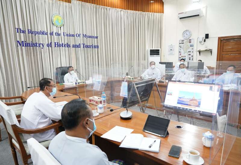 ဟိုတယ်နှင့်ခရီးသွားဆိုင်ရာ ဝန်ဆောင်မှုလုပ်ငန်းများကို ဘေးကင်းလုံခြုံသော ဝန်ဆောင်မှု လုပ်ငန်းများအဖြစ် အသိအမှတ်ပြုလက်မှတ်များ Online မှတစ်ဆင့် လျှောက်ထားအတည်ပြု ထုတ်ပေးနိုင်ရေးအတွက် “Enchanting Myanmar Health and Safety Protocol” Website မိတ်ဆက်ရှင်းလင်းခြင်း အခမ်းအနားကို ယနေ့ ညနေပိုင်းတွင် ဟိုတယ်နှင့် ခရီးသွားလာရေး ဝန်ကြီးဌာန၊ နီလာအစည်းအဝေးခန်းမ၌ Video Conferencing စနစ်ဖြင့် ကျင်းပပြုလုပ်သည်။