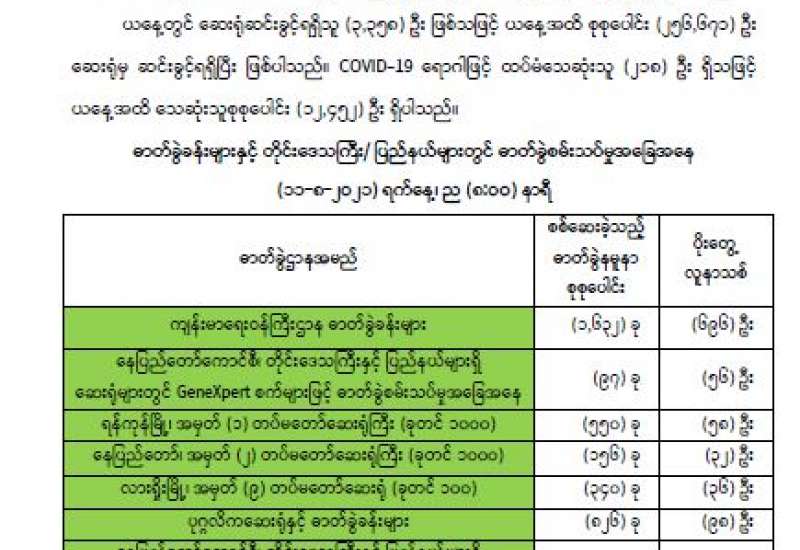 ကိုဗစ်-၁၉ ရောဂါအတည်ပြု လူနာများနှင့် သီးသန့်စောင့်ကြည့်ရမည့် သူများထားရှိရန်အတွက် တိုင်းစစ်ဌာနချုပ် နယ်မြေအသီးသီးရှိ တပ်မတော်ဆေးရုံ များ၊ နယ်မြေခံသင်တန်းကျောင်းများ၊ စစ်ကြောရေးနှင့်တည်းခိုရေးစခန်းများ၌ ကြိုတင်ပြင်ဆင်မှုများကို လုပ်ဆောင်လျက်ရှိပြီး ပြီးစီးသည့်နေရာများတွင် စနစ် တကျလက်ခံ၍ ကျန်းမာရေးစောင့်ရှောက်မှုလုပ်ငန်းများ ဆောင်ရွက်ပေးလျက်ရှိသည်။ ထို့ပြင် ကျန်းမာရေးဝန်ကြီးဌာနနှင့် အခြားဌာနဆိုင်ရာ တာဝန်ရှိသူများ၊ ပရဟိတအဖွဲ့အစည်းများ၊ တာဝန်သိပြည်သူများနှင့် ပူးပေါင်း၍လည်း သက်ဆိုင်ရာ မြို့နယ်များ၌ Quarantine Center များကိုလည်း ပြင်ဆင်ဆောင်ရွက်လျက် ရှိသည်။