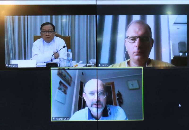 ၂၀၂၁ ခုနှစ်၊ ဒီဇင်ဘာလအတွင်း ကျင်းပရန်လျာထားသည့် တတိယအကြိမ် ရုရှား-မြန်မာ အစိုးရအချင်းချင်း ကုန်သွယ်ရေးနှင့် စီးပွားရေးပူးပေါင်းဆောင်ရွက်ရေး ပူးတွဲကော်မရှင် အစည်းအဝေးနှင့် နှစ်နိုင်ငံစီးပွားရေး လုပ်ငန်းရှင်များအချင်းချင်း တွေ့ဆုံဆွေးနွေးမှုအစီအစဉ်ကို စက်တင်ဘာလအတွင်း ကျင်းပနိုင်ရေးတို့အတွက် နှစ်ဖက်ညှိနှိုင်းစီစဉ် ဆောင်ရွက်နေမှုနှင့် စပ်လျဉ်း၍ ရင်းနှီးမြှုပ်နှံမှုနှင့် နိုင်ငံခြားစီးပွားဆက်သွယ်ရေးဝန်ကြီးဌာန၊ ဒုတိယဝန်ကြီး ဦးသန်းအောင်ကျော်နှင့် ရုရှားဖက်ဒရေးရှင်း နိုင်ငံသံရုံးမှ စီးပွားရေးကောင်စစ်ဝန်ဖြစ်သူ Mr. Andrei Iunak တို့က ဗီဒီယိုကွန်ဖရင့်ဖြင့် ဆွေးနွေးခြင်းကို ယနေ့မွန်းလွဲပိုင်းတွင် နေပြည်တော်ရှိ ရင်းနှီးမြှုပ်နှံမှုနှင့်နိုင်ငံခြား စီးပွားဆက်သွယ်ရေးဝန်ကြီးဌာန၊ အစည်းအဝေးခန်းမ၌ ပြုလုပ်သည်။