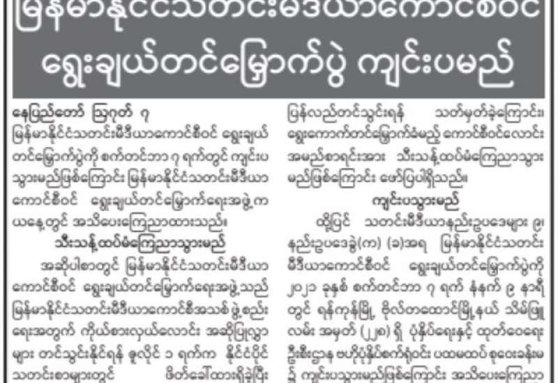 မြန်မာနိုင်ငံသတင်းမီဒီယာကောင်စီဝင် ရွေးချယ်တင်မြှောက်ပွဲကို စက်တင်ဘာ ၇ ရက်တွင် ကျင်းပသွားမည်ဖြစ်ကြောင်း မြန်မာနိုင်ငံသတင်းမီဒီယာကောင်စီဝင် ရွေးချယ်တင်မြှောက်ရေး အဖွဲ့က ယနေ့တွင် အသိပေးကြေညာထားသည်။