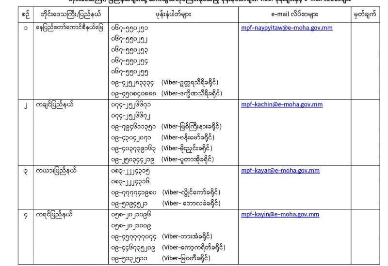 ယခုကာလအတွင်း လူသတ်မှု၊ လုယက်မှု၊ မီးရှို့မှု၊ မိုင်းဖောက်ခွဲမှု၊ လုံခြုံရေးတပ်ဖွဲ့ဝင်များအား ရည်ရွယ်ချက်ရှိရှိ တိုက်ခိုက်မှု၊ ပြည်သူ့ ဝန်ထမ်းများနှင့် ပြည်သူအချို့အား အုပ်စုဖွဲ့ ကိုယ်ထိလက်ရောက် တိုက်ခိုက်မှု၊ အစိုးရပိုင်အဆောက်အဦများနှင့်ပုဂ္ဂလိကပိုင်အဆောက်အဦ များအား ဖျက်ဆီးမှု၊ (CDM) လှုပ်ရှားမှုတွင် ငွေကြေးအရဖြစ်စေ၊ အခြားနည်းလမ်းဖြင့် ဖြစ်စေ၊ နက်ရှိုင်းစွာ ကာယကံမြောက် ပါဝင်သူ များမှအပ စိုးရိမ်စိတ်ကြောင့် ထွက်ပြေးတိမ်းရှောင်နေကြသည့် ဝန်ထမ်းများ၊ အသိပညာရှင်၊ အတတ်ပညာရှင်များ၊ အခြားနယ်ပယ် အသီးသီးမှ ပုဂ္ဂိုလ်များ၊ နိုင်ငံသားများအနေဖြင့် ဥပဒေဘောင်အတွင်း ပြန်လည်ဝင် ရောက်မည်ဆိုပါက ၎င်းတို့အပေါ် ရေးဖွင့်ထားသည့် အမှုများကို ဥပဒေနှင့်အညီပိတ်သိမ်းခြင်း၊ ရုပ်သိမ်းခြင်းများ ဆောင်ရွက် ပေးမည်ဖြစ်သည့်အတွက် မြန်မာနိုင်ငံရဲတပ်ဖွဲ့ ကွပ်ကဲမှုအောက်ရှိ တိုင်းဒေသကြီးနှင့် ပြည်နယ်အသီးသီးရှိ ရဲတပ်ဖွဲ့များသို့ ယုံကြည် စိတ်ချစွာဖြင့် ဆက်သွယ်နိုင်ရန် တယ်လီဖုန်းနံပါတ်များအား ဩဂုတ် ၃ ရက်မှစ၍ နေ့စဉ် သတင်းထုတ်ပြန်ကြေညာခဲ့ပြီး ဖြစ်သည်။