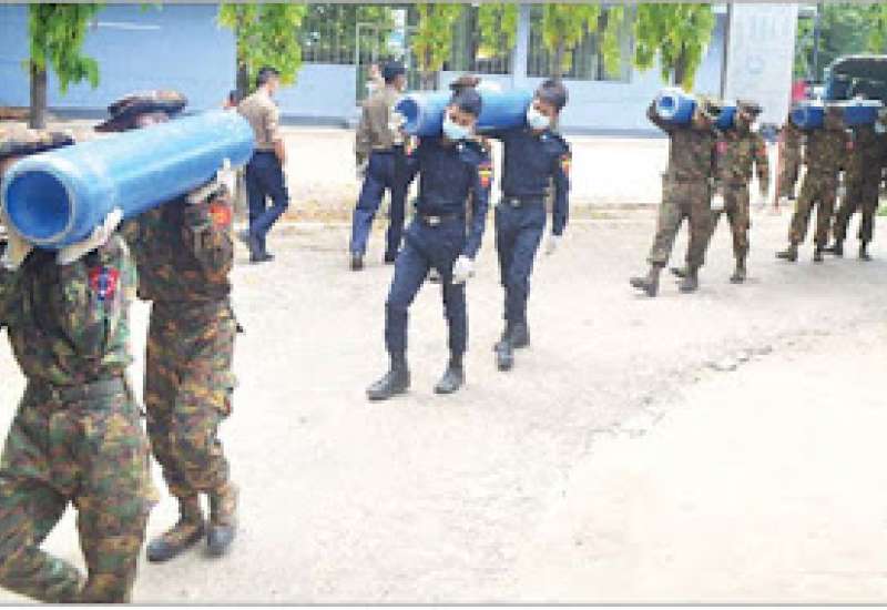 ကိုဗစ်-၁၉ ရောဂါဓာတ်ခွဲအတည်ပြု ပိုးတွေ့လူနာများနှင့် သီးသန့်စောင့် ကြည့်ရမည့်သူများကို ကုသရေး လုပ်ငန်းများ ဆောင်ရွက်ရာတွင် အောက်ဆီဂျင် လိုအပ်ချက်များကို တစ်ဖက်တစ်လမ်းမှ အထောက်အကူပြု စေရန်အတွက် တပ်မတော်နှင့် အလှူရှင်များက အောက်ဆီဂျင်အိုးများ၊ ရောဂါကာကွယ်ရေး အထောက် အကူပြုပစ္စည်းများကို တိုင်းဒေသကြီးနှင့် ပြည်နယ်အသီးသီးရှိ ပြည်သူ့ဆေးရုံများ၊ တပ်မတော် ဆေးရုံများ၊ ကျန်းမာရေးဌာနများ၊ ကိုဗစ်စင်တာများနှင့် လူမှုကူညီရေး အသင်းအဖွဲ့များသို့ ပေးပို့လှူဒါန်းလျက် ရှိသည်။