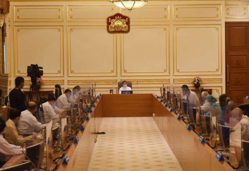 နိုင်ငံတော်စီမံအုပ်ချုပ်ရေးကောင်စီ အစည်းအဝေး (၁၃/၂၀၂၁)ကို ယနေ့မွန်းလွဲပိုင်းတွင် နေပြည်တော်ရှိ နိုင်ငံတော်စီမံ အုပ်ချုပ်ရေးကောင်စီဥက္ကဋ္ဌရုံး အစည်းအဝေးခန်းမ၌ ကျင်းပရာ နိုင်ငံတော်စီမံအုပ်ချုပ်ရေးကောင်စီဥက္ကဋ္ဌ၊ နိုင်ငံတော် ဝန်ကြီးချုပ် ဗိုလ်ချုပ်မှူးကြီးမင်းအောင်လှိုင် တက်ရောက်အမှာစကားပြောကြားသည်။