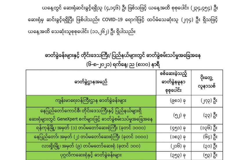 တရုတ်ပြည်သူ့သမ္မတနိုင်ငံမှ ရောက်ရှိနေသည့် ကိုဗစ်-၁၉ ရောဂါကာကွယ် ဆေး SINOPHARM ဆေးကို ရန်ကုန်တိုင်းဒေသကြီး၊ မရမ်းကုန်းမြို့နယ်၊ မင်းဓမ္မလမ်းရှိ ပြည်သူ့ကျန်းမာရေး ဦးစီးဌာန၊ ဗဟိုကာကွယ်ဆေးသိုလှောင်ခန်း၊ တိုးချဲ့ကာကွယ်ဆေးထိုးလုပ်ငန်း၌ထားရှိရာ အဆိုပါဆေးပစ္စည်းများကို Cold Chain Delivery Logistics မော်တော်ယာဉ်ကြီးများ၊ တပ်မတော်လေယာဉ်၊ ရဟတ်ယာဉ်များဖြင့် တိုင်းဒေသကြီးနှင့် ပြည်နယ်များသို့ ဆက်လက်ဖြန့်ဖြူးပေးလျက်ရှိသည်။