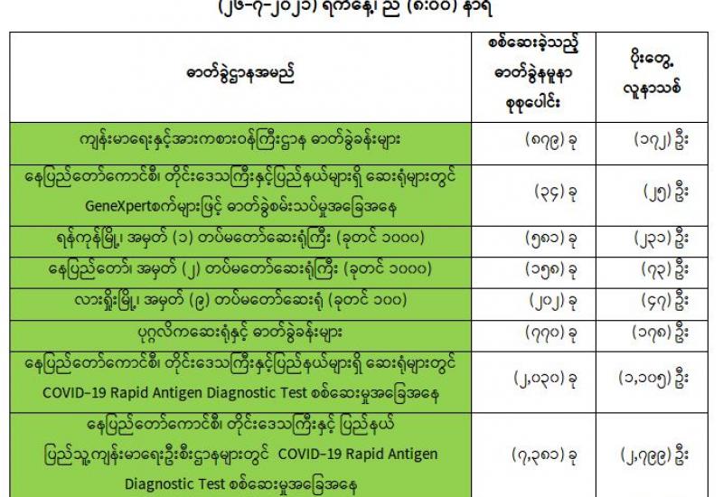 (၂၆-၇-၂၀၂၁)ရက်နေ့၊ ည (၈:၀၀)နာရီမှ (၂၇-၇-၂၀၂၁)ရက်နေ့၊ ည (၈:၀၀)နာရီအတွင်းဓာတ်ခွဲနမူနာစုစုပေါင်း(၁၃,၆၅၇)ခုအား စစ်ဆေးပြီးစီးခဲ့ရာCOVID-19 ရောဂါဓာတ်ခွဲအတည်ပြုလူနာသစ်(၄,၉၆၄)ဦးတွေ့ရှိရပါသည်။သို့ဖြစ်ပါ၍ ယနေ့အထိ ဓာတ်ခွဲနမူနာစုစုပေါင်း(၃,၁၀၂,၆၈၈)ခုအား စစ်ဆေးခဲ့ပြီး COVID-19 ဓာတ်ခွဲအတည်ပြုလူနာ စုစုပေါင်း (၂၇၉,၁၁၉) ဦး ရှိပြီ ဖြစ်ပါသည်။