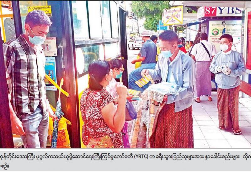 လတ်တလော ဖြစ်ပေါ်နေသော ကိုဗစ်-၁၉ ကပ်ရောဂါ တတိယလှိုင်းကာလ၌ ရန်ကုန်မြို့အတွင်း မဖြစ်မနေသွားလာလှုပ်ရှားနေသော ခရီးသွားပြည်သူများ ကိုဗစ်-၁၉ ကပ်ရောဂါပြန့်ပွားမှုကို ကာကွယ် ထိန်းချုပ်နိုင်ရေးအတွက် ရန်ကုန်တိုင်းဒေသကြီး ပုဂ္ဂလိကသယ်ယူ ပို့ဆောင်ရေးကြီးကြပ်မှုကော်မတီ(YRTC)က ပြည်သူများ ပူးပေါင်းပါဝင် လှူဒါန်းမှုနှင့်အတူ နှာခေါင်းစည်း စုစုပေါင်း နှစ်သိန်းခွဲကျော်ကို အခမဲ့ဖြန့်ဝေပေး မည်ဖြစ်ကြောင်း YRTC မှ သိရသည်။