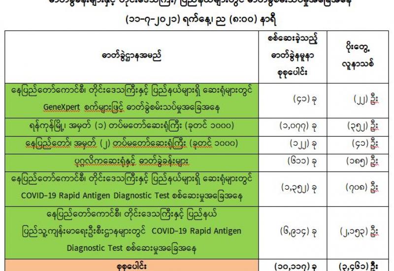 (၁၀-၇-၂၀၂၁) ရက်နေ့၊ ည (၈:၀၀) နာရီမှ (၁၁-၇-၂၀၂၁) ရက်နေ့၊ ည (၈:၀၀) နာရီအတွင်း ဓာတ်ခွဲနမူနာစုစုပေါင်း (၁၀,၁၁၇) ခုအား စစ်ဆေးပြီးစီးခဲ့ရာ COVID-19 ရောဂါ ဓာတ်ခွဲအတည်ပြု လူနာ သစ် (၃,၄၆၁) ဦး တွေ့ရှိရပါသည်။ သို့ဖြစ်ပါ၍ ယနေ့အထိ ဓာတ်ခွဲနမူနာ စုစုပေါင်း (၂,၈၆၆,၈၁၄) ခု အား စစ်ဆေးခဲ့ပြီး COVID-19 ဓာတ်ခွဲအတည်ပြုလူနာ စုစုပေါင်း (၁၉၂,၂၁၃) ဦး ရှိပြီ ဖြစ်ပါသည်။